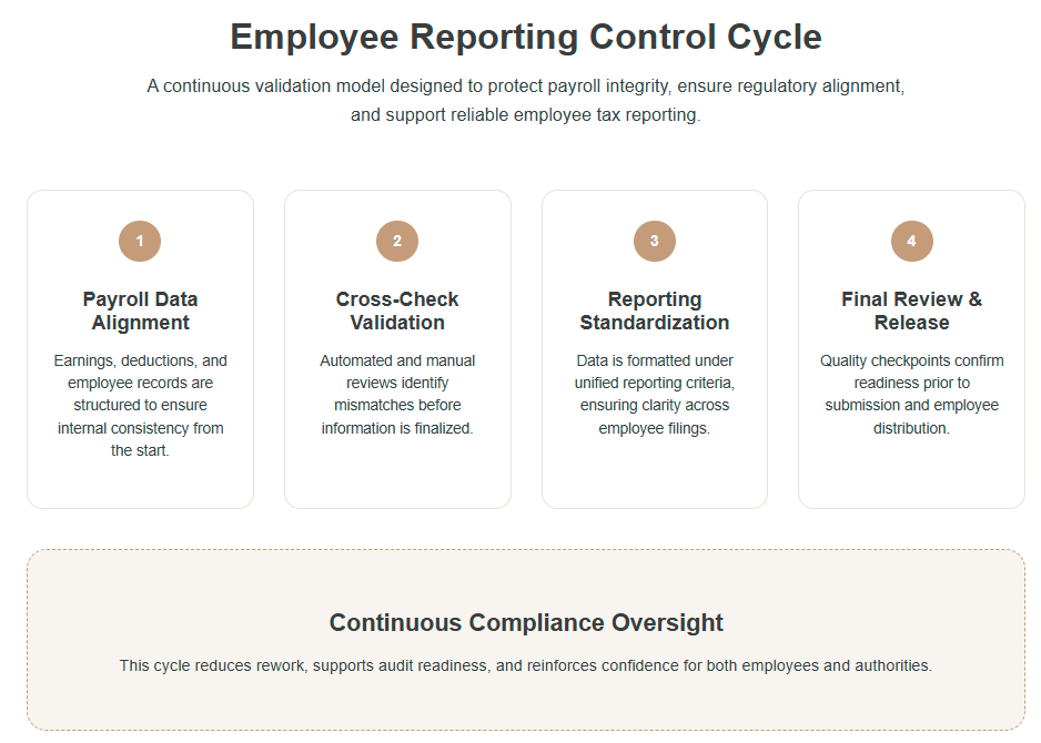 We implement strict review and validation processes to ensure that all reported information is accurate, consistent, and compliant. Our controls help build trust by reducing errors and ensuring reliable reporting to both employees and tax authorities.